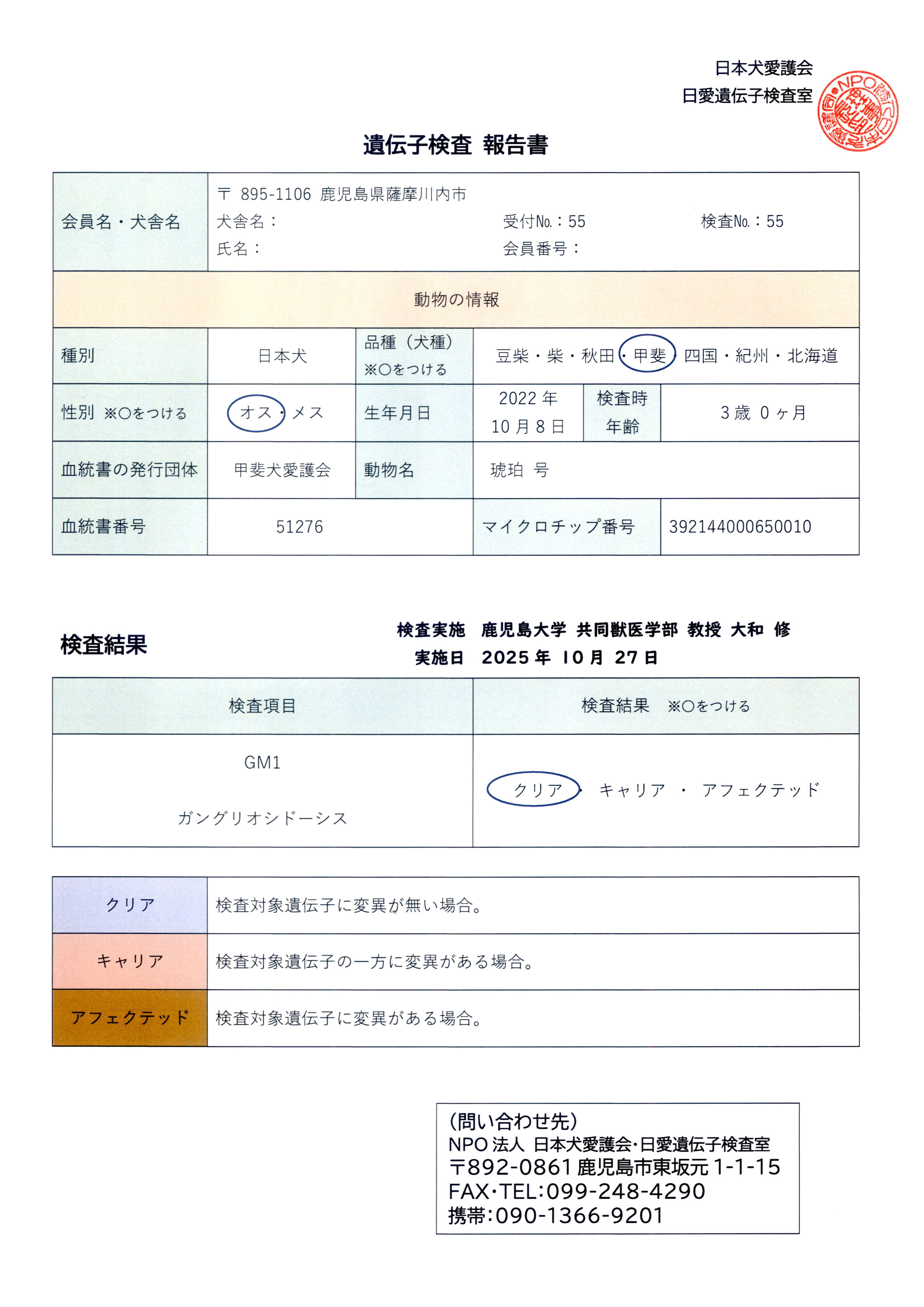 2022年10月8日、兵庫県高砂市生まれ。2023年12月11日、鹿児島県薩摩川内市に移住、家庭犬として大切に育てられている。誰に対しても友好的で落ち着いた性格。甲斐犬愛護会に登録された生粋の甲斐犬(♂)で国指定天然記念物。母「舞香」は愛護会第147回展壮犬牝の部1席、母の父「鉄親」は愛護会第142回展未成犬牡の部1席、父の父「風真の虎侍狼」は愛護会第150回展総合優良犬優勝、父の母「甲斐の虎姫」は愛護会第140回展総合優良犬準優勝、母の父の父「鉄海」は愛護会第140回展総合優良犬優勝、母の母の母「御嵩乃多花」は愛護会第129回展総合優良犬優勝、父の父の母「利根の夢花」は愛護会第134回展未成犬牝の部1席、父の母の母「甲斐の章姫」は愛護会第128回展壮犬牝の部3席他、近親の賞歴等多数あり。ラインブリーディング(近交係数約1.123%)で生まれた。GM1ガングリオシドーシスの遺伝子検査結果はクリア。 【犬名】血統登録名=琥珀 呼び名=こはく 【毛色】中虎毛(黒約5割、茶約5割) 【肩高】42cm 【体重】約11kg 【尾型】差尾 【嗜好】ドッグフード 【犬籍登録・所属団体】甲斐犬愛護会 |