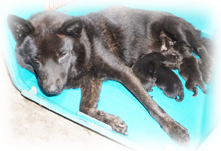 2025年10月15日、「甲斐ノ花月姫(呼び名=レオ)」が仔犬を出産しました。黒虎毛♂1頭、♀2頭の計3頭です。血統登録は甲斐犬愛護会となります。甲斐ノ花月姫は常に周囲に気を配りながら慎重に行動する甲斐犬本来の優れた資質を持つ犬で、その父「国分の勝宗」は愛護会第145回展成犬牡の部5席、父の父「拳斗」は第134回展成犬牡の部1席、異母姉「紅乃桜華」は第149回展壮犬牝の部2席、異母兄「影虎」は第147回展未成犬牡の部2席、母の母「北杜ノ銀虎」は第134回展未成犬牝の部4席、父の母の父および母の母の父「大門武」は愛護会第136回展総合優良犬優勝、母の父の父「国分の真」は愛護会第133回展壮犬牡の部2席、仔犬たちの父「虎鉄」は当犬舎の生まれで、その母「高竜乃朧月夜」および父「夕霧」は救助犬、高竜乃朧月夜の母の父の弟「信州の大信」は愛護会第142回展総合優良犬優勝、母の父の父「甲斐黒信」は愛護会第117回展総合優良犬優勝、母の父の兄「榛名の英心」は愛護会第128回展総合優良犬優勝、母の父の姉「矢乃頭の織姫」は愛護会第124回展壮犬牝の部2席、夕霧の父の父「神流の天真」は愛護会第127回展総合優良犬優勝、父の同胎「天久乃真姫」は愛護会第142回展総合優良犬準優勝、父の父の父「利根の一心」は愛護会第119回展壮犬牡の部1席他、両親とも近親の賞歴等が多数あり、遺伝的な障害も見られず極めて健康です。ラインブリーディング(近交係数約1.1597%)で生まれた仔犬たちです。 |