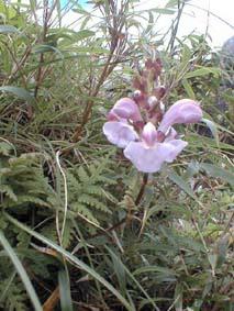 高さ30cm程の半寄生植物。葉はシダの葉の様な形。花の長さは3cm程で上唇は大きく曲っている。