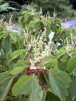 アカメガシワ <赤芽柏> Mallotus japonicus MUELL. ARG. [トウダイグサ科アカメガシワ属] 分布:本州、四国、九州、沖縄 開花期:6月 用途:床柱、下駄、薪炭 薬用:樹皮を野梧桐(やごとう)と呼び、煎じ薬、粉末、エキス剤として消炎鎮痛薬とし、胃潰瘍、十二指腸潰瘍、胃酸過多、胆石症、はれものなどに用いられる。成分はイソクマリン類のbergeninの他、rutin、malloprenolなどが知られている。 日向に生ずる落葉高木。雌雄異株。伐採地、崩壊地などにすぐに生えてくる。根が地中で長く延び、その途中から萌芽が生じるので、その一帯が雄または雌の木だけとなる。成長が早く、数年で高さ3〜8mになる。新芽は紅紫色で細かい星状毛が多いが、後に毛の多くは脱落する。葉は互生で赤い長柄があり卵形または円形、先端は伸びて尖り、しばしば浅く2〜3裂する。葉柄の上端より少し離れた葉の縁に花外蜜線があり、アリが集まるので他の虫を寄せ付けない。枝先に総状あるいは円錐状の花序を出し、多数の小花を付ける。さく果は3角状の球形で3室、外面に柔らかい棘が多い。熟すると開裂して紫黒色球形の種子を出す。 |