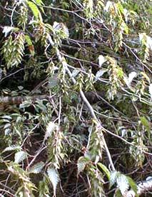 アカシデ <赤四手> Carpinus laxiflora BLUME [カバノキ科クマシデ属] 分布:北海道、本州、四国、九州、朝鮮、中国 開花期:4〜5月 用途:庭木、公園樹、盆栽、床柱、曲木細工、ステッキ、農具の柄、おもちゃ、スキー、くつ型、荷棒、家具など 落葉高木。高さ15m、径60cmに達する。樹皮は滑らかで暗灰白色。老木になるとすじ状のくぼみができる。材は堅密で弾力性に富み、灰白色で心辺材の区別は不明瞭である。葉は互生し、長さ4〜8cmの卵形または卵状楕円形で、初めは多少毛があるが、のちには無毛となる。若葉は赤色で目立つ。イヌシデは葉に毛が多いので容易に区別出来る。雄花序は黄褐色で長さ4〜10cm、前年枝から垂れ下がる。雌花序は本年枝の先につく。果穂は長さ5〜6cm、果苞は葉状で基部の両側に小さな裂片がある。 |