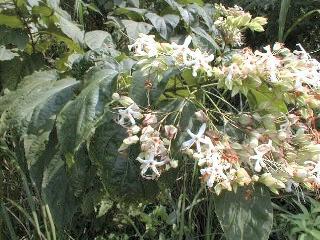 アマクサギ [クマツヅラ科] 分布:九州南部〜沖縄諸島久米島 開花期:7〜9月 落葉低木。全国で普通に見られるクサギに似るが、葉には毛がなく、少し厚くて光沢がある。花もまばらである。屋久島ではクサギは確認されていない。屋久島でクサギと呼ばれているのはアマクサギで、クサギ同様葉に特有の匂いがあるが、塩でもみ、よくゆでて水にさらしてからあえ物や炒めものにする。春から秋口まで若い葉を摘んで食用にする。花は白く芳香がある。果実は黒く熟し、紅紫色のがくとの対比が美しい。 |