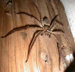アシダカグモ <脚高蜘蛛> [クモ綱クモ目アシダカグモ科アシダカグモ属] 日本には1000種類以上、世界では30000種類以上のクモがいる。 英名:spider 分布:本州(関東以南の太平洋側)、四国、九州、沖縄、世界の温帯から熱帯に広く分布 網を張らない徘徊性の大型のクモで、頭胴長3cm、脚を広げると12cm以上に達する。平均寿命は雄5年、雌7年程で、雄は8回、雌は10回脱皮して成体となるが、その後雄は1回、雌は3回脱皮する。雄では触肢の先が膨らんで生殖器の一部となる。よく人家に住むが、室内を歩き回ることは少なく、食べ物の上なども這わず、人を咬むこともない。また人に害を及ぼすゴキブリ(特にクロゴキブリ)を好んで食べ、消化液には病原菌を殺す力もある。時にはトノサマガエル、カヤネズミなどを食べることもある。産卵は日本では年2回、卵嚢を作り、1回の産卵で300個前後産む。母グモは卵嚢の中で子グモが孵化するまで餌を食べずに卵嚢を抱えている。孵化すると卵嚢を離すが近くにいて見守る。子グモは1週間程すると出廬し、更に1〜2日すると分散する。分散する時は風のよく通る場所に移動し、風が吹いてくると腹部から糸を出し、糸と共に風に乗って飛ばされ遠くまで分散する。 |