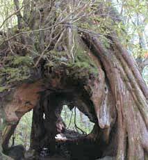 中空になっている杉が1350年程前に倒れた一代目、それに覆い被さっているのが350年程前に伐採された二代目、更に上に生えているのが350歳程の三代目です。三代目は樹高38m以上あり、屋久島で一番背の高い杉だと言われています。