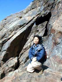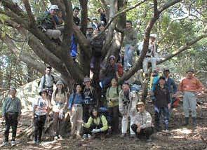 アコウの木の下で記念撮影。サルのように木に登ったりぶら下がったりして、童心に帰って楽しんでいる人達もいました。 | ![]() ここは眼下に海が見下ろせるとても景色の良い所です。でも急斜面で一歩間違うと転げ落ちてしまいそうです。後ろの岩は真中に穴が空いていてトンネルになっています。どうしてこんな風になったのか自然の不思議さに驚かされます。 |