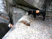 岩の割目に隠れた人を探し出して吠える