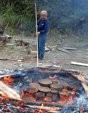 今日待ちに待った野焼をしました。雨の為焼くのが延び延びになっていました。大きなたき火のようで面白かったです。途中小雨が降り心配しましたが、なんとか無事に焼けた様です。土器を焼くついでにカライモ(サツマイモ)まで焼き、お昼には近くで山菜を摘んで天ぷらにし、みんなでおいしくいただきました。