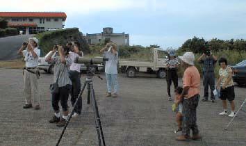 野鳥に詳しい水野明紀さんの講師でサシバ観察会(バードウォッチング)が行われました。サシバは夏鳥として本州〜九州に渡来しますが、南西諸島では殆ど旅鳥として春と秋に通過し、一部が越冬します。この日は秋の渡りでこれから東南アジアに向けて旅立っていくサシバを観察しました。多い時には何十羽も上昇気流に乗って柱状に見えるので鷹柱と呼ばれますが、この日は最高で十七羽程の群でした。サシバ以外にもマミジロタヒバリ、ハクセキレイ、イソヒヨドリ、ヒヨドリ、トビ、モズ、スズメ、ツバメなどが見られました。