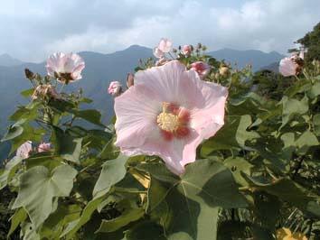 フヨウ <芙蓉> Hibiscus mutabilis [アオイ科フヨウ属] 分布:四国(高知県南部)、九州(南部〜屋久島)、沖縄、中国、台湾 開花期:7〜11月 用途:庭木 落葉低木。暖地の沿海地に生え、高さ1〜4mになる。花は直径10〜14cmの大輪で一日でしぼむ。スズメガの仲間がよく蜜を吸いに来る。屋久島では秋がフヨウの花の最盛期。県道沿いなどの開けたところに、淡い紅色や純白の美しい大輪の花を咲かせている。フヨウの花と言えば美人のたとえ。樹皮は大変丈夫で、水にさらして紙や布の原料に使われてきた。 |