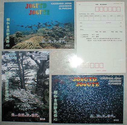 左の写真はQSLカード(交信証)というもので、HAMが交信したことを証明するために、交信した相手局に送る(渡す)カードです。ただし多くの局と交信した場合、各局に送っていたのでは郵送料などもばかにならないので、通常はJARL(社団法人日本アマチュア無線連盟)に一括して送り、各局に転送してもらいます。 写真右上が交信証明欄で、相手局のコールサイン、移動地、RST{了解度、信号強度、音調(電信のみ)}、自局のコールサイン、移動地、無線機および出力、アンテナの型式および地上高、そして交信した年月日、時間、周波数、電波型式などを記入します。 交信証明欄以外は、公序良俗に反するものでない限り、自由に文字、絵、写真などを入れたり、ステッカーなどを貼ることが出来ます。左の写真はすべて私達のカードで、左上は津守浦でスキンダイビングをした時の写真、右下は四瀬でスキンダイビングをした時の写真、左下はヤクシマシャクナゲとサクラツツジの写真をそれぞれ使用し、更に地域を表わす記号、私たちのコールサイン、標語などを入れて作ったオリジナルカードです。 |