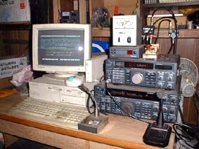 左の写真は以前住んでいた借家の固定局の様子です。左のパソコンはMS-DOSだけで動いている少し古い機種で、ハムログ(HAM交信管理プログラム)、パケット通信(HAMの電波を使ったパソコン通信)などで使用していました。右下は1.9MHz帯から29MHz帯の無線機で、その上が144MHz帯から1200MHz帯の無線機、その上にTNC(無線機とパソコンにつなぎパケット通信等に使用)、電鍵(モールス通信に使用)、TNCの上にローテーター(アンテナの向きを変える機械)のコントローラーなど、所狭しと並んでいました。 | |