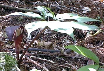 茎は芋の形で地中にあるので、地上部分は一枚の葉と花だけである。葉柄は長さ25cm程で、葉は幅5cm、長さ15cm程の5〜7の小葉に分れる。花は地表付近から出て咲く。花序軸は白く、仏焔苞は暗紫色。