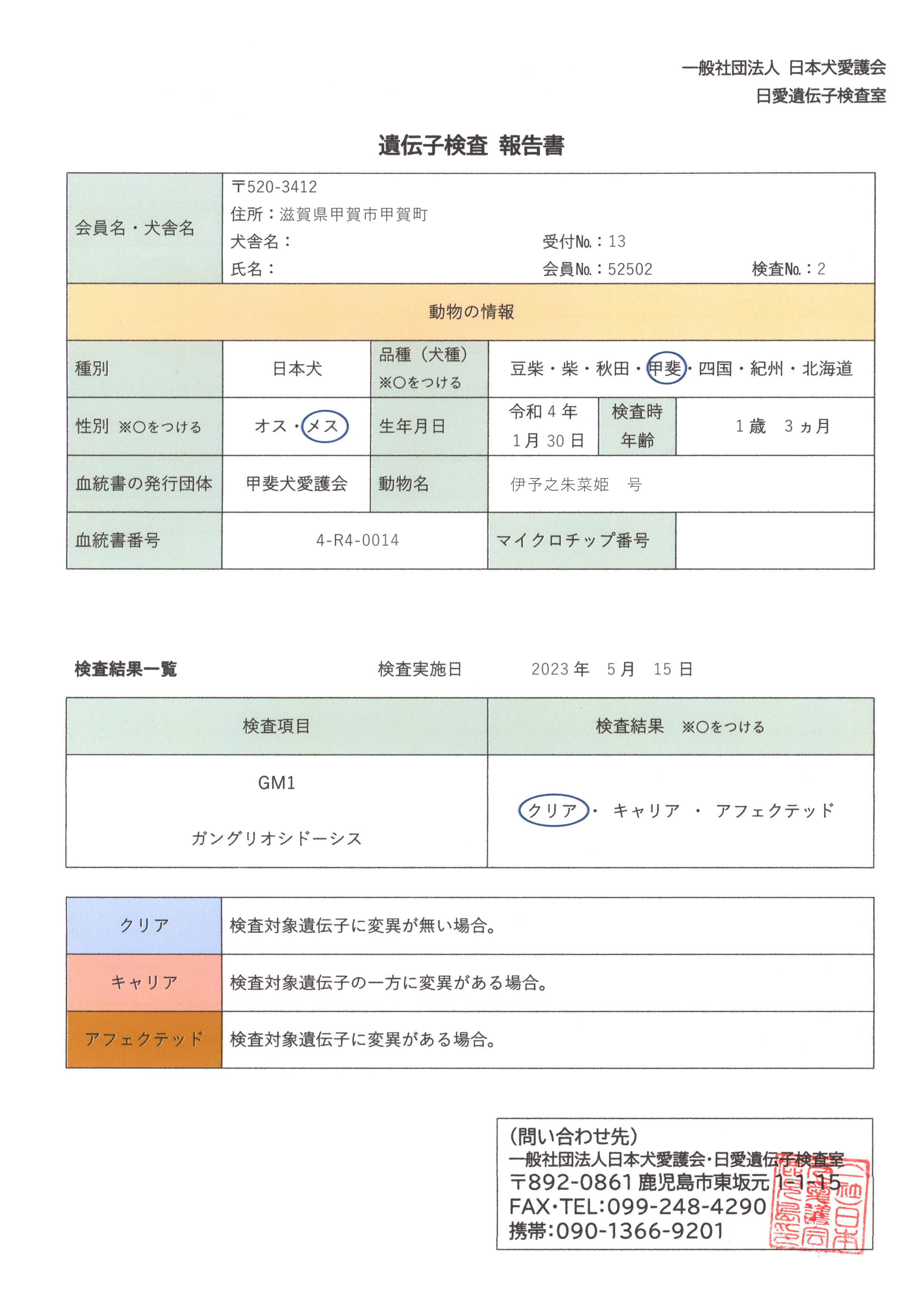 【犬籍登録・所属団体】甲斐犬愛護会