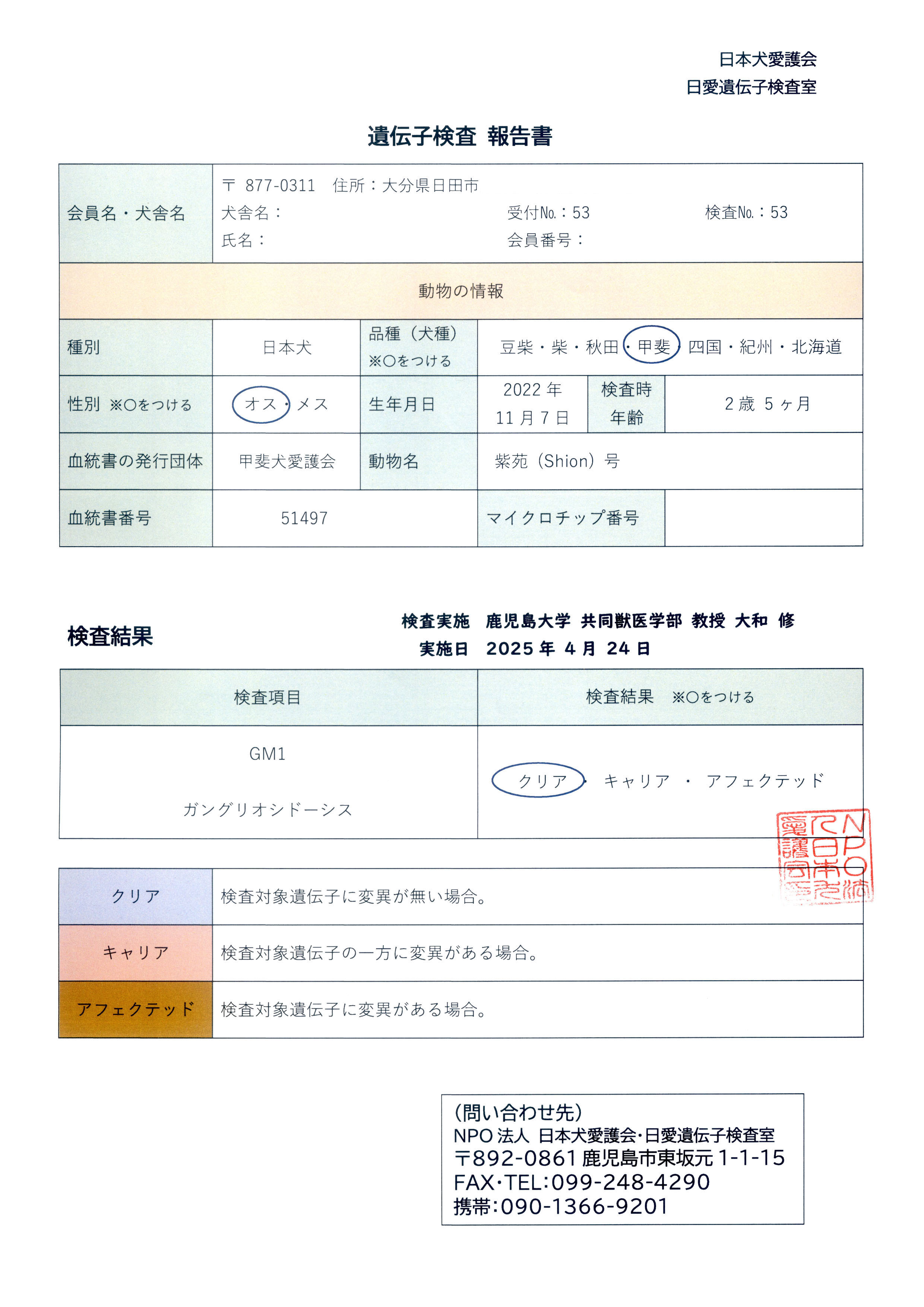 2022年11月7日、熊本県上益城郡山都町生まれ。2023年12月下旬、大分県日田市に移住、猟犬及び家庭犬として大切に育てられている。それなりに警戒心は持っているが比較的友好的。甲斐犬愛護会に登録された生粋の甲斐犬(♂)で国指定天然記念物。「ハオ」と同胎。母の異母兄「周防の海王」は愛護会第155回展成犬牡の部1席、母の父の異母妹「童夢の梅花」は愛護会第148回展壮犬牝の部4席、父の母の異母弟「白鳳乃寅太籠」は愛護会第147回展壮犬牡の部5席、父の母の異母妹「白鳳の華」は愛護会第148回展壮犬牝の部6席、父の父の父の父「神流の天真」は愛護会第127回展総合優良犬優勝、父の母の父の父「白鳳の龍」は愛護会第116回展総合優良犬優勝、父の父の父の同胎「夕霧」は救助犬、父の父の母の父の同胎「雲居の雁(2世)」は東日本大震災に出動した救助犬、その息子「玄(Nuuk)」は日本から初めてフィンランドに行った甲斐犬でフィンランド、デンマーク、ドイツ、エストニア等のドッグショーでチャンピオン歴多数他、近親の賞歴等多数あり。アウトブリーディングで生まれた。GM1ガングリオシドーシスの遺伝子検査結果はクリア。 【犬名】血統登録名=紫苑(しおん) 呼び名=しおん 【毛色】黒虎毛(黒約7割、茶約3割) 【肩高】58cm 【体重】約23.5kg 【尾型】登録は差尾だが現状は巻尾 【嗜好】ドッグフード、猪肉、鹿肉 【犬籍登録・所属団体】甲斐犬愛護会 |
