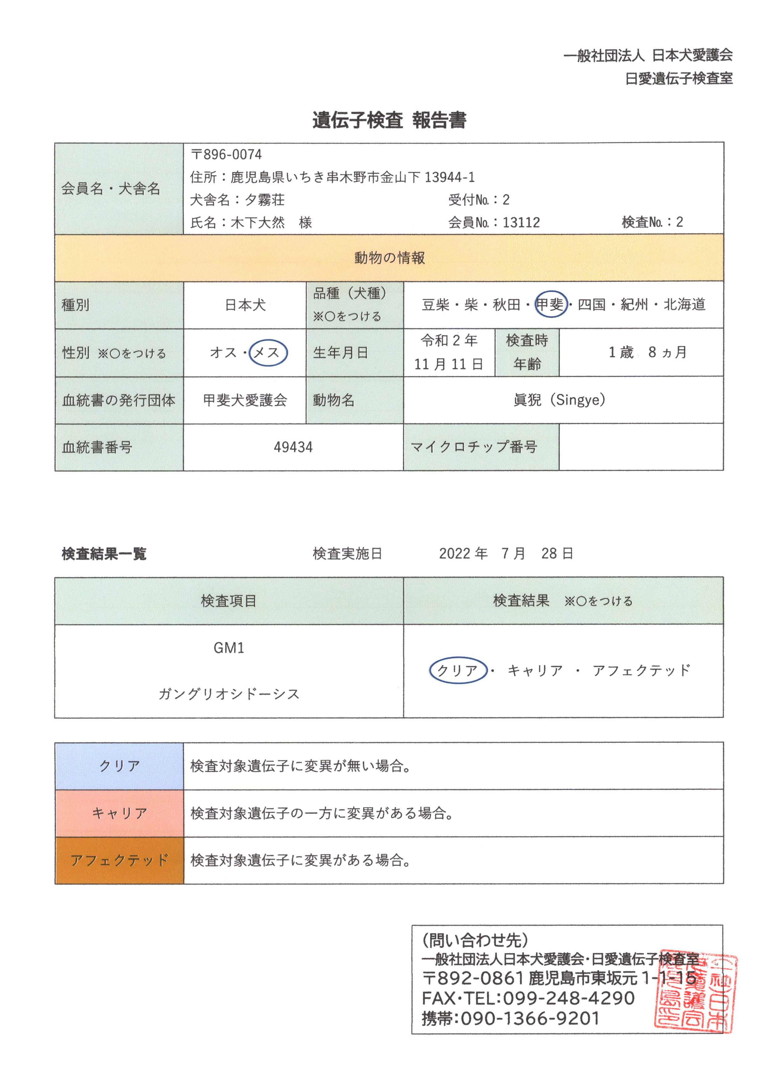 2020年11月11日、宮崎県えびの市生まれ。2021年2月2日、鹿児島県いちき串木野市に移住。甲斐犬本来の優れた資質を持ち、警戒心が強く家族以外にはなかなか心を開かないが、性格はとても良く、綺麗好きで子育てがとても上手。ブータンの親友によりゾンカ(ブータン語)で獅子を意味する「Singye」と名付けられ、漢字で「眞猊」と当てる。甲斐犬愛護会に登録された生粋の甲斐犬(♀)で国指定天然記念物。母「日向の赤姫」および父「日向ノ赤虎」は宮崎県えびの市で猟犬として使役され、母の母は救助犬として訓練している「高竜乃朧月夜」、母の父も救助犬として訓練している「夕霧」、息「空虎」は愛護会第155回展未成犬牡の部4席、父の父「南アルプスのアトム」は愛護会第137回展壮犬牡の部2席、母の父の父「神流の天真」は愛護会第127回展総合優良犬優勝、母の父の同胎「天久乃真姫」は愛護会第142回展総合優良犬準優勝、父の母の同胎「彩香の宙姫」は愛護会第140回展成犬牝の部3席、父の母の父の父「南陽の力皇」は愛護会第130回展総合優良犬優勝、母の父の父の父「利根の一心」は愛護会第119回展壮犬牡の部1席他、近親の賞歴等多数あり。ラインブリーディング(近交係数約2.4658%)で生まれた。GM1ガングリオシドーシスの遺伝子検査結果はクリア。 【犬名】血統登録名=眞猊(シンゲ) 呼び名=Singye |