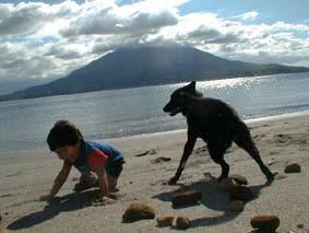 磯海岸で息子の倭賢と遊ぶ