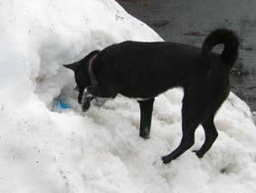 | 標高1200メートルの紀元杉付近で、雪の中に人を埋めて雪崩捜索訓練をした。倭賢、香里、大然の順に隠れて捜索させたが、いずれもすぐ雁に見付けられた。雪の中に完全に人が埋まっている場合には、雁はすぐに吠えずに、ある程度雪を掘って中に人がいることを確認した上で吠え始める。 |