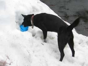 吠える前に掘り始めるのはどの犬も自然にやるようです。遭難者に近づこうという行動を強化するのは、捜索意欲を高めるためにも必要なことですから、訓練としては、遭難者の所まで到達して吠える、というのが一番良いと思います。雪が深くて犬だけでは掘り出せない場合は、ヘルパー、ハンドラー以外の協力者(擬似捜索隊)が掘るのを手伝ってやります。ハンドラーが掘ってやると、ハンドラーを呼ぶために吠えるようになり、ちょっと気になる場所があると気軽に「ここ掘ってみて」とハンドラーを見ながら吠えるようになるのでよくありません。 なお、雪崩捜索で吠えることについて一部には議論もありますが、雪崩再発の危険については科学的根拠に基づいた弱層テストで判断し、危険が大きい場合には捜索に入るべきではありません。 また、足跡追求的な探し方になったり、人がいじった痕跡を手がかりにするような癖がついたりしないように、雪に馴れた後は、ヘルパーを埋めた後は周辺にも掘り返した場所を作ったり歩き回って足跡をつけたりして、生身の人間の臭気以外の手がかりを作らないようにしていきます。