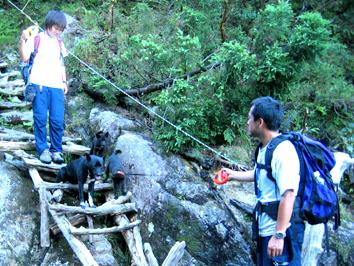 標高差約400m、距離片道約2kmという、かなり険しい道のりを往復しました。凛、ピリカはまだ3ヶ月なので、この険しい道は無理かなと思っていましたが、往復とも殆ど自力で歩き通しました。雁の捜索訓練の時、平山と餅田に隠れてもらい、そのすぐ近くにそれぞれの担当の子犬をつないでもらいました。雁にとっては他の犬がいても気にせず捜索するという訓練になると思いますが、子犬にとっては雁が吠えてご褒美をもらうところを見る訳で、このような訓練を重ねれば、子犬は「どうしたらご褒美がもらえるんだろう?」と考えるのではないかと思いやってみました。