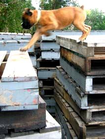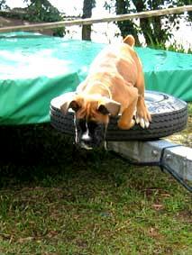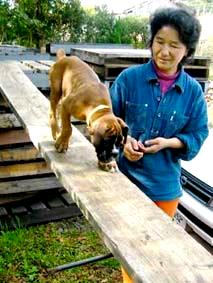 | 「飛んで」の号令で巾跳をさせる訓練、「渡って」の号令で高所に渡した板の上を歩かせる訓練、「下りて」の号令で落差を下りさせる訓練を始めました。ハンドラーは犬が落ちていやな思いをしないよう、細心の注意を払います。 |