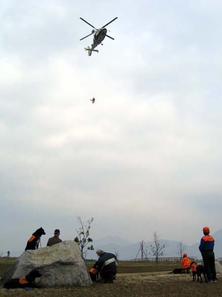 熊本県防災消防航空隊の協力により、九州救助犬協会主催のヘリ馴致訓練を行った。まずは近付いてくるヘリの音に犬を十分馴らし、次に航空隊隊員がヘリからロープを垂らして懸垂下降をして私たちのすぐ近くに降りたり、ロープにぶら下がったまま頭上を低空でホバリングした。その後、地上でエンジンを回しているヘリのキャビンにハンドラーと犬が乗り、最後に飛行しながら馴らす訓練をした。途中で航空隊に救急搬送の指令が入ったため、全員がヘリに乗ることはできなかったが、犬、ハンドラー共にとても良い訓練になった。