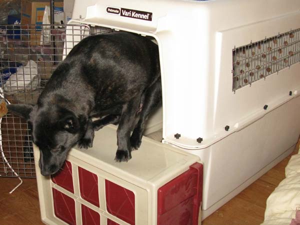 籠の入口の下半分を塞いで仔犬が出られないようにする