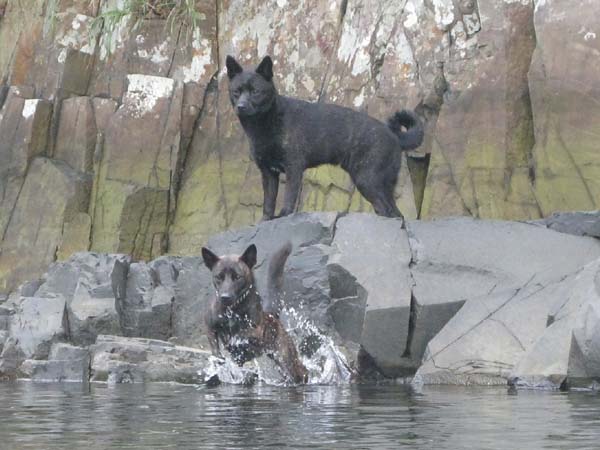 ロッキー(上)に水泳の手本を示すため飛び込ませる