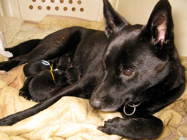 生まれたばかりの仔犬たちに授乳する