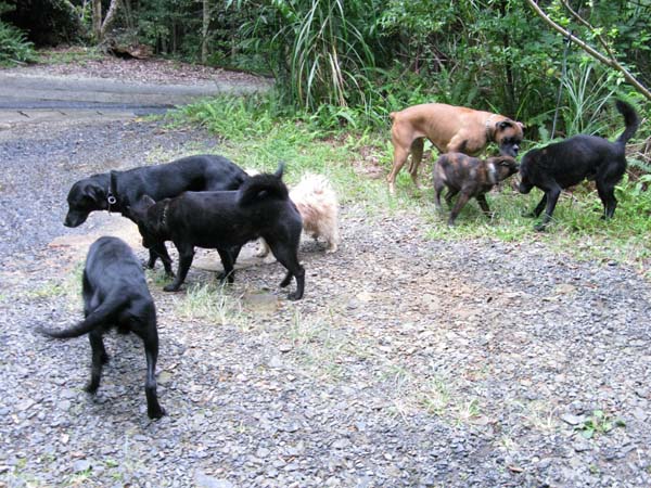 2010年10月8日(屋久島町安房樋ノ口)![]() 他の犬との付合い方を教える(学ぶ)ことは犬の社会化期における要点の一つ 左側手前からジャスパー、雁、無垢、ルビー、夕霧、レン、うつぼ号 |