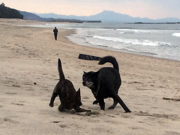 広々とした砂浜で思う存分遊ぶ雁(右)と月(左)