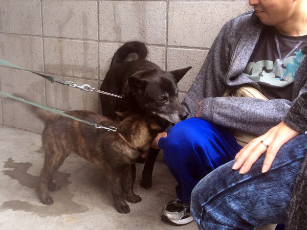 初めて会う人たちに遊んでもらう雁(後)と月(前)