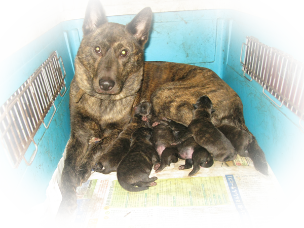 生まれて間もない仔犬たちに母乳を与える。