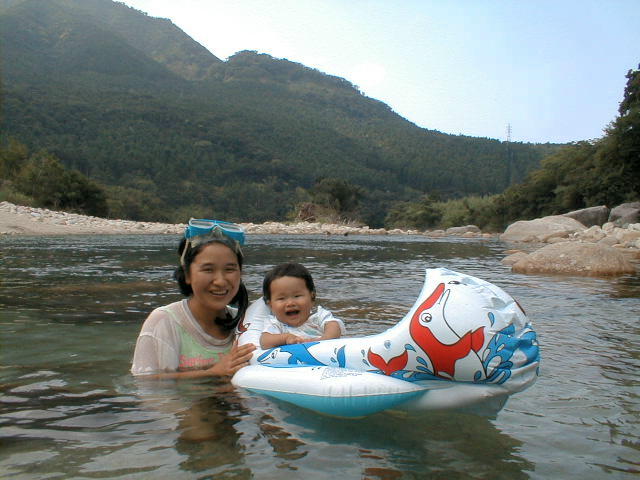 | 夏の暑い昼下がりには川遊びが一番!水はとても奇麗で、アユ、ヨシノボリ、ボウズハゼ、オオウナギ、クサフグ、ボラの子、エバ(ギンガメアジの子)などの魚が見られます。屋久島のアユは本土アユが小型化したもので、リュウキュウアユではありません。友釣りなどで島外から違う遺伝子を持つアユを持ち込むことは禁物です。昭和46年には多摩川のヤマメが安房川上流に放流され、現在でも小杉谷周辺でよく見掛けますが、これも屋久島の生態系からみれば不自然です。アユやヤマメに限らず、また屋久島に限らず、それぞれの地域でそこの生態系を維持していくには細心の注意が必要です。 |
