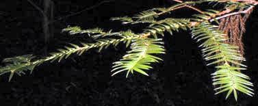 カヤ <榧> Torreya nucifera SIEB. et ZUCC. [イチイ科カヤ属] 分布:本州(宮城県以西)、四国、九州、朝鮮(済州島) 開花期:4〜5月 用途:庭木、建築・彫刻材、碁盤、将棋盤、風呂桶 薬用:種子は榧実と呼び、脂肪油を多量に含むほか、固体酸を約9%、液体酸(油酸、リノール酸など)のグリセリドを含む。葉は精油を0.2%含み、その主成分はリモーネン約60%、その他カンフェン、ピネン、カジネン、トレヨールなど。また二重分子フラボンのカヤフラボンを含む。 常緑高木。雌雄異株。山地に生え、大きいものは胸高直径2.5m、高さ35mにもなる。左の写真のものは胸高直径8cm程。樹皮は青灰色で老木になると縦に薄くはがれる。葉は長さ2〜3cmの線形で固く、先は鋭く尖る。実は油を絞ったり、炒って食べることが出来、菓子の原料となる。 |