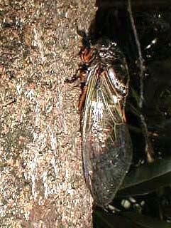 クマゼミ Cryptotympana japonensis KATO はんし [半翅目セミ科] 日本にいるセミは20種程だが、世界では1500種程記録されている。樹木の幹や枝に産み付けられた卵から孵った幼虫は土中にもぐり、樹木の根から液を吸って成長する。幼虫期間は2〜3年から、長いものでは北米のジュウシチネンゼミの様に10年以上のものもいる。鳴くのは♂だけ。成虫は1週間〜10日程しか生きない。 英名:cicada 分布:本州(東京以西)、四国、九州、沖縄、中国 暖かい地方に多く、ミカン、カキ、センダンに多いという。鳴き声は大きく、シャアシャア(シャンシャン、センセン)と聞こえる。成虫は7月中旬〜9月上旬に見られる。体は黒色で金灰色の微毛がある。翅は透明、翅脈は緑色。体長約65mmで日本最大。 |