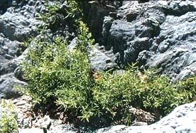 クサスギカズラ Asparagus cochinchinensis (LOUR.) MERR. [ユリ科] 分布:四国、九州の海岸 薬用:肥大した塊根を天門冬(てんもんどう)と呼び、夏〜秋に採取し、皮を除き天日乾燥する。根に澱粉、粘液質などを含む。 海岸の砂地に自生する多年草。根茎は短く多数の多肉根を付ける。茎の下部は木化し、上部はつる状で長さ1〜2m。葉の様に見えるのは葉状枝で非常に細かい。夏に淡黄色の小花を腋生する。花柄の中央に関節があり、液果は濁った白色。和名はスギに似てつる状であるから。塊根は砂糖漬けとし、また煮て食用にする。野菜のアスパラガスはこれと同じ属。 |