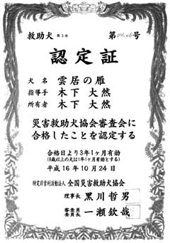 ←NPO法人全国災害救助犬協会発行の救助犬第3種認定証