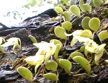 マメヅタラン <豆蔦蘭> Bulbophyllum drymoglossum MAXIM. [ラン科] 分布:本州、四国、九州、朝鮮 開花期:5月 山中の樹木や岩上に着生する小型のランで、根茎は細長く這い、まばらに葉と根を付ける。葉はやや肉質で楕円形をなし、長さ7〜13mm、幅5〜10mmほど、深緑色の常緑性で先は丸く柄は無い。花柄は葉の基部から出て長さ10mmほどで細く、頂に1個の花を付ける。花は淡黄色で直径12〜15mm、がく片は広皮針形で尖り、長さ7〜8mm、花弁は著しく小さい。唇弁は広皮針形でがく片より短い。和名はその葉がシダのマメヅタによく似ているため。 |