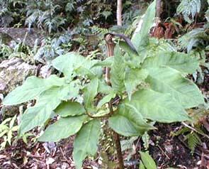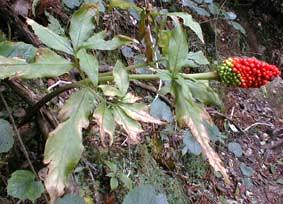 マムシグサ <蝮草> Arisaema serratum SCHOTT forma thunbergii MAKINO [サトイモ科テンナンショウ属] サトイモ科の花は無柄で肉質の花茎の表面に付き、肉穂花序を作る。花序の基部には大型の仏焔苞(ぶつえんほう)が付く 分布:本州(関東以西)、四国、九州 開花期:3〜5月 薬用:球茎を秋に採り輪切りにして天日乾燥。去痰、鎮痙、鎮静、消炎薬として2〜5gを水400ccで煎じ、一日2〜3回に分服する。民間薬としては水虫に球茎の生汁を塗布し、また擂りおろした球茎を布に塗って肩こり、リウマチ、胸痛などの患部に貼って消炎、鎮痛薬とする。 やや湿った山地に自生する多年草。茎にマムシの様な斑点がある。地下に径5cmくらいで扁球形の根茎を作り、上の方からひげ根を周囲に出す。茎は30〜50cm。仏焔苞は緑色、または暗紫色で縦に白い縞があり、長さ9〜15cm、先は鋭く尖っていて尾の様に長く伸びることもある。果実は赤く熟し、液果が密生したトウモロコシ様の果穂となる。 |