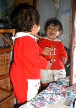 | やっと少し立つことが出来るようになりました。まだまだ安定が悪くすぐに座ってしまいますが、歩けるようになるのももうすぐですね。今まで以上に目が離せなくなりそうです。 |