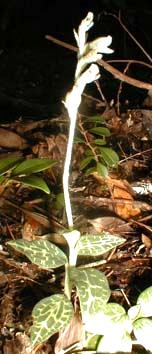 ミヤマウズラ <深山鶉> Goodyera schlechtendaliana REICHB. fil. [ラン科] 分布:本州、四国、九州 開花期:8〜9月 山中の林内に生える小さい多年草で、茎は地上を這って長さ12〜25cmとなり、まばらに葉を互生する。葉は狭卵形で、淡い斑紋が入り、長さ2〜4cm、幅1〜2.5cm、先は尖り、基部は丸く、長さ1〜2cmの柄と茎を包む鞘がある。花茎は長くて、2〜3個の包片が付き、花序とともに密に縮れ毛がある。花序は5〜10cmあって、7〜12個の花を一方に向けて開き、花は白色で微かに紅色を帯び、長さ8〜10mm、半開する。和名はその葉の網紋がウズラの斑紋に似ているため。 |