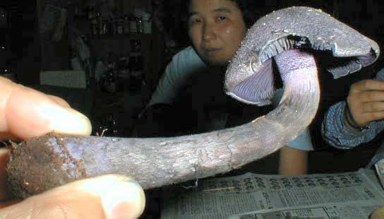 ムラサキフウセンタケ <紫風船茸> Cortinarius violaceus (FR.) FR. [ハラタケ目フウセンタケ科フウセンタケ属] 分布:日本、欧州、北米など 料理:油煮、バター炒め、てんぷら、けんちん汁、おろし和え。 傘の径5〜12cm位。半球形、丸山形から開いて中高の扁平となる。表面は乾燥質で暗紫色、暗紫色のササクレ状細毛を密生する。肉は厚く青紫色ないし灰紫色。ヒダはやや疎、暗紫色からさび褐色となり茎に直生または上生する。茎は高さ6〜12cm、径1〜2.5cm位、暗紫色で堅く内部は充実し下方は膨らむ。秋季、主に針葉樹林に散生または孤生する。歯切れ、口当たりとも良く、脂肪質の料理に合う。 |