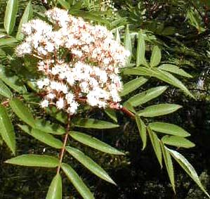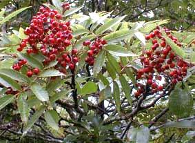 ナナカマド <七竈> Sorbus commixta HEDL. [バラ科ナナカマド属] 分布:北海道、本州、四国、九州、アジア東北部(屋久島が南限) 開花期:5〜6月 用途:庭木、街路樹、花材、果実酒、材は小細工物、槌、かんな台、薪炭、樹皮は染料 山地に生える落葉高木。高さは普通6〜10mだが、15mになるものもある。和名ナナカマドは、材が非常に燃え難く7度かまどに入れても燃え切らないという意味で、固くて腐朽しにくい。果実は直径5〜6mmの球形で赤く熟す。果実酒にしたナナカマドの実は4ヶ月〜半年で取り出し、砂糖を加えて煮てジャムに出来る。秋は紅葉も美しい。 |