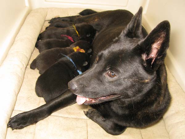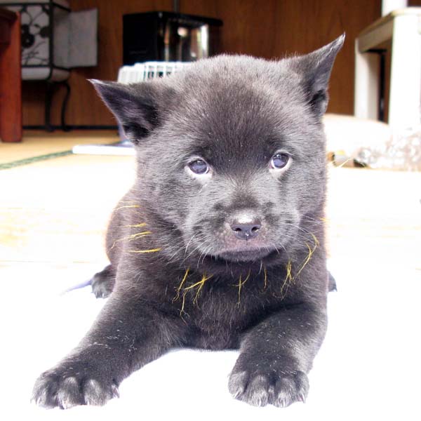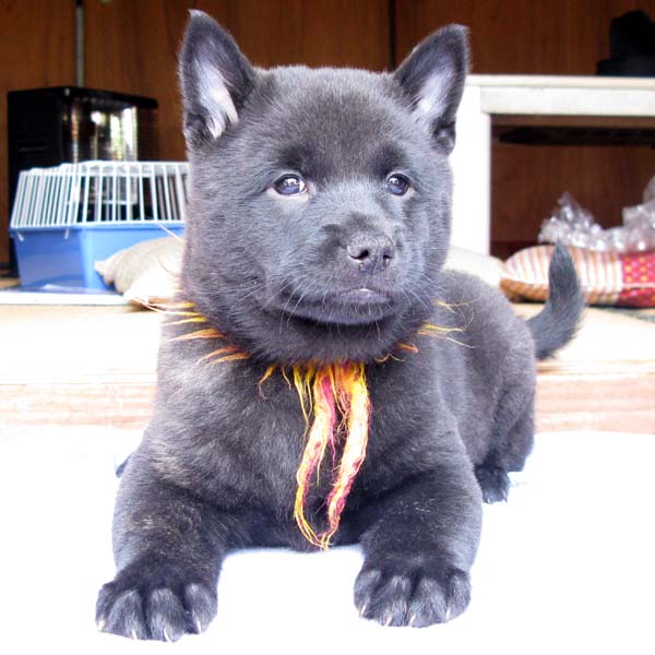 2009年1月25日に雲居の雁(2世){呼び名=雁(かり)}が仔犬を出産しました。全て黒虎で♂3頭、♀2頭です。血統登録は甲斐犬愛護会となります(日本犬保存会へ移籍可)。雁は救助犬として屋久島の遭難者捜索に関わったり、エコツアーに同行して救助犬の広報、宣伝のために頑張っています。ツアー参加者や周りの観光客からは雁がいることで場が和む、癒されると大変喜ばれています(雁の健康管理と訓練日誌)。交配相手は鹿児島市に住む「うつぼ」号で、その父犬は甲斐犬愛護会の第113回展覧会壮犬牡の部3席、母犬は第120回展覧会未成犬牝の部5席となっています。両親とも優良な血統で、遺伝的な障害も見られず極めて健康です。アウトブリーディングで生まれた仔犬たちです。 |