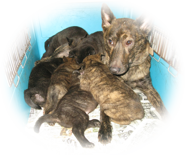 2017年5月8日に高竜乃朧月夜{呼び名=月(つき)}が仔犬を出産しました。赤虎毛♀2頭、中虎毛♀2頭、黒虎毛♀2頭の計6頭です。毛色は成長と共に変化しますので、現在の所見からの予想です。血統登録は甲斐犬愛護会となります(日本犬保存会へ移籍可)。月は救助犬として訓練途上ですが、動物は子育てをすることで記憶力などの学習能力が向上することが証明されていますので、今後の訓練と活躍に期待しています(月の健康管理と訓練日誌)。交配相手は同じく屋久島で救助犬として訓練している赤虎毛の「夕霧」で、月と共に近親の賞歴等が多数あります(夕霧の健康管理と訓練日誌)。両親とも優良な血統で、遺伝的な障害も見られず極めて健康です。ラインブリーディング(近交係数約1.3672%)で生まれた仔犬たちです。 |