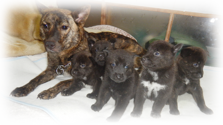 2022年4月10日、眞猊(呼び名=Singye)が仔犬を出産しました。中虎毛♂2頭、♀3頭の計5頭です。毛色は成長と共に変化しますので、現在の所見からの予想です。血統登録は甲斐犬愛護会となります(日本犬愛護会等へ移籍可)。眞猊は甲斐犬本来の優れた資質を持つ犬で、母の両親は救助犬として訓練しています。交配相手の美倶佐も救助犬として訓練中で、甲斐犬本来の優れた資質を持つ犬で眞猊と共に近親の賞歴等が多数あります。両親とも優良な血統で、遺伝的な障害も見られず極めて健康です。アウトブリーディングに近いラインブリーディング(近交係数約0.5493%)で生まれた仔犬たちです。