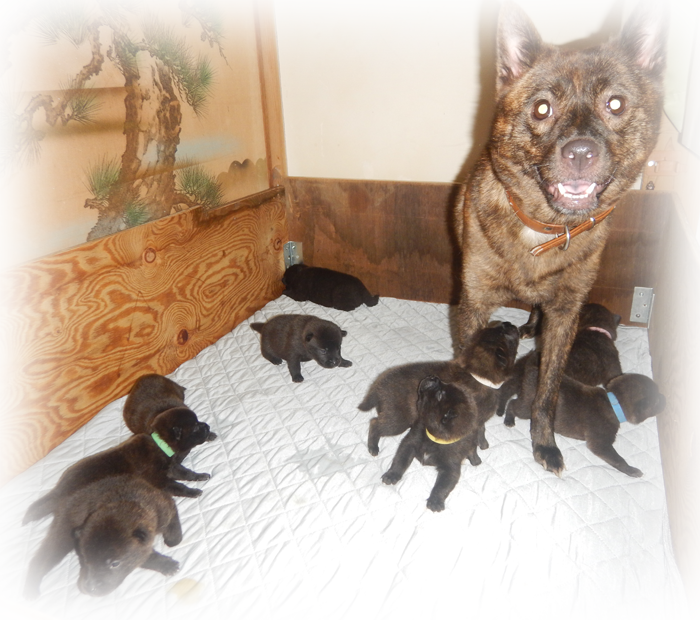 2023年8月16日、「星野舞姫(呼び名=はる)」が仔犬を出産しました。赤虎毛♂3頭、♀2頭、中虎毛♂1頭、♀1頭、黒虎毛♂1頭、♀1頭の計9頭です(中虎毛♀1頭死亡)。毛色は成長と共に変化しますので、現在の所見からの予想です。血統登録は甲斐犬愛護会となります。星野舞姫は甲斐犬本来の優れた資質を持つ犬で、両親とも救助犬として訓練しています。仔犬たちの父「美倶佐」も救助犬として訓練中で、甲斐犬本来の優れた資質を持つ犬で星野舞姫と共に近親の賞歴等が多数あります。両親とも優良な血統で、遺伝的な障害も見られず極めて健康です(死亡個体を除く)。アウトブリーディングに近いラインブリーディング(近交係数約0.6348%)で生まれた仔犬たちです。 |