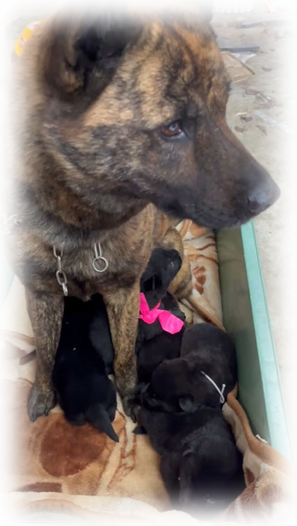 2024年3月21日、提携犬舎の「西都の風(呼び名=ふう)」が仔犬を出産しました。中虎毛♂1頭、黒虎毛♂4頭の計5頭です。血統登録は日本犬愛護会となります。西都の風の先祖は代々優れた猟犬として使役され、彼女もその跡を継いでいます。仔犬たちの父は同じく猟犬として使役している「紀ノ国暁(呼び名=げん)」で、遺伝的な障害も見られず極めて健康です。両親共に優秀な猟犬として、また父犬の近親には賞歴等が多数あり、甲斐犬本来の優れた資質を持つ優良な血統です。アウトブリーディングで生まれた仔犬たちです。 |