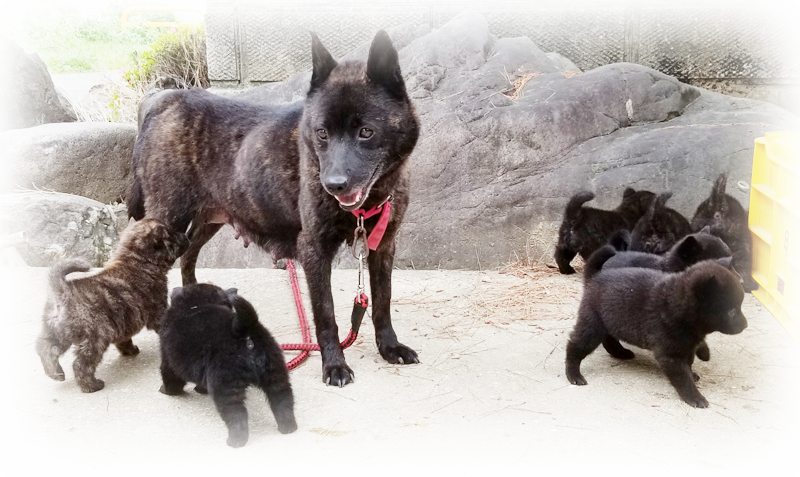 2025年4月13日、「紀ノ国和香{呼び名=和香(わか)}」が仔犬を出産しました。赤虎毛♂1頭、中虎毛♂2頭、黒虎毛♂1頭、♀3頭の計7頭です。毛色は成長と共に変化しますので、現在の所見からの予想です。血統登録は甲斐犬愛護会となります。紀ノ国和香は兵庫県高砂市の生まれで、その父「鉄海」は愛護会第140回展総合優良犬優勝、母「舞香」は愛護会第147回展壮犬牝の部1席、父の父「」は愛護会第133回展総合優良犬優勝、母の父「鉄親」は愛護会第142回展未成犬牡の部1席、母の母の母「御嵩乃多花」は愛護会第129回展総合優良犬優勝、仔犬たちの父「紀ノ国武志」は当犬舎の生まれで愛護会第154回展未成犬牡の部2席、その父の母「高竜乃朧月夜」は救助犬、父の父「夕霧」も救助犬、父の父の父「神流の天真」は愛護会第127回展総合優良犬優勝、父の父の同胎「天久乃真姫」は愛護会第142回展総合優良犬準優勝、父の父の同胎の息「天久乃明真」は愛護会第145回展総合優良犬優勝、父の父の異母妹「神流の紗莉」は愛護会第143回展総合優良犬準優勝、父の父の父の姉「川崎ノ凛虎」は愛護会第126回展総合優良犬準優勝他、両親とも近親の賞歴等多数あり、甲斐犬本来の優れた資質を持つ優良な血統で、遺伝的な障害も見られず極めて健康です。ラインブリーディング(近交係数約0.1526%)で生まれた仔犬たちです。