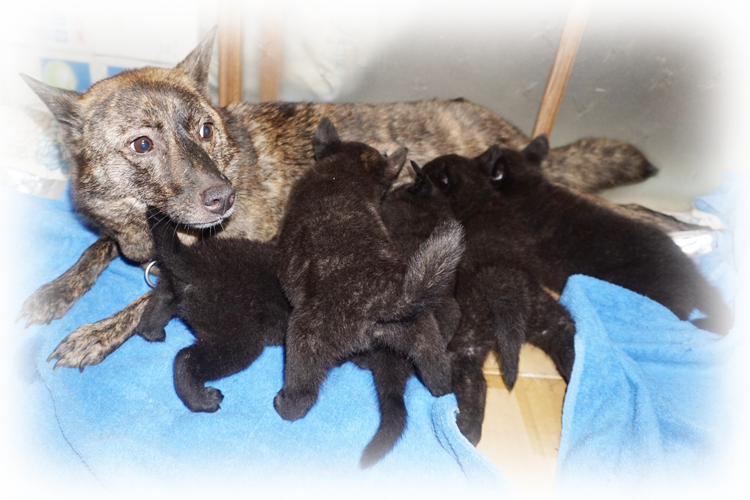 2025年5月22日、「眞猊(呼び名=Singye)」が仔犬を出産しました。黒虎毛♂5頭です。毛色は成長と共に変化しますので、現在の所見からの予想です。この日は「国際生物多様性の日」です。血統登録は甲斐犬愛護会となります。眞猊は甲斐犬本来の優れた資質を持つ犬で、その母の母は救助犬として訓練している「高竜乃朧月夜」、母の父も救助犬として訓練している「夕霧」、息「空虎」は愛護会第155回展未成犬牡の部4席、父の父「南アルプスのアトム」は愛護会第137回展壮犬牡の部2席、母の父の父「神流の天真」は愛護会第127回展総合優良犬優勝、母の父の同胎「天久乃真姫」は愛護会第142回展総合優良犬準優勝、父の母の同胎「彩香の宙姫」は愛護会第140回展成犬牝の部3席、仔犬たちの父「」は和歌山県有田郡有田川町の生まれで、その母の母「播磨の琴姫」は愛護会第136回展成犬牝の部2席、母の父「千太狼」は愛護会第145回展未成犬牡の部3席、母の母の父「彩の神」は愛護会第137回展総合優良犬優勝、母の父の父「」は愛護会第141回展成犬牡の部2席、父の母の父「鉄海」は愛護会第140回展総合優良犬優勝、父の母の母「舞香」は愛護会第147回展壮犬牝の部1席他、両親とも近親の賞歴等が多数あり、甲斐犬本来の優れた資質を持つ優良な血統です。アウトブリーディングに近いラインブリーディング(近交係数約0.7141%)で生まれた仔犬たちです。